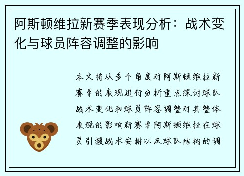阿斯顿维拉近年来在英超的表现逐渐提升,俱乐部在引援上的策略和投入也表明他们正在朝着更高目标迈进。在这个赛季,他们完成了多笔关键的引援,进一步加强了球队的阵容,明确表态将目标定为英超前六名的竞争者。这一系列签约不仅增强了球队的实力,也彰显了俱乐部的雄心。本文将从四个方面详细分析阿斯顿维拉在完成新援签约...